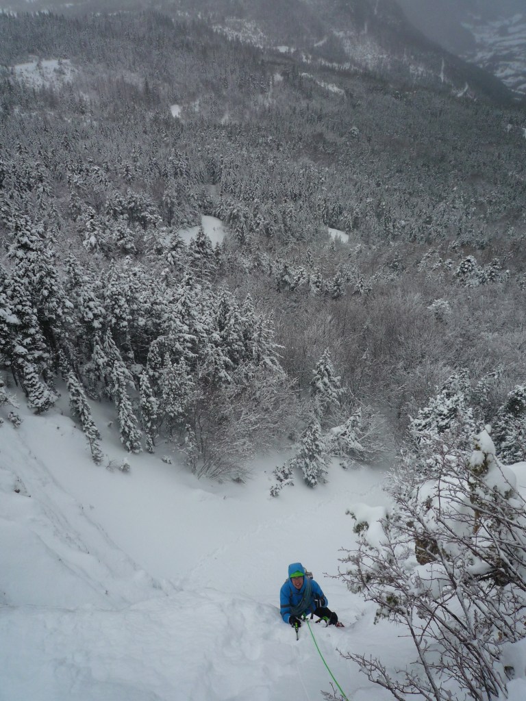 On s’équipe, on vide la neige de la capuche et me voilà parti dans la première longueur, il va falloir nettoyer toute cette neige sinon y’a plus qu’a sortir les skis.