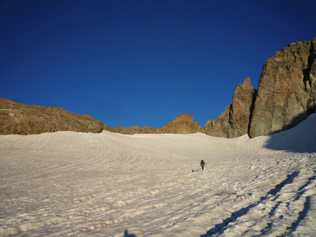 Après la voie de la veille à Sialouze et la météo de fou annoncée, on se dirige vers la pointe des Boeufs Rouges. Départ du Sélé à 4h, l’approche sur le bas du glacier enfin ce qu’il en reste sous les cailloux est vraiment interminable… On retrouve enfin le vrai glacier et le soleil levant, ça va déjà mieux ! On va rejoindre le col du Sélé et le début de l’arête du jour.