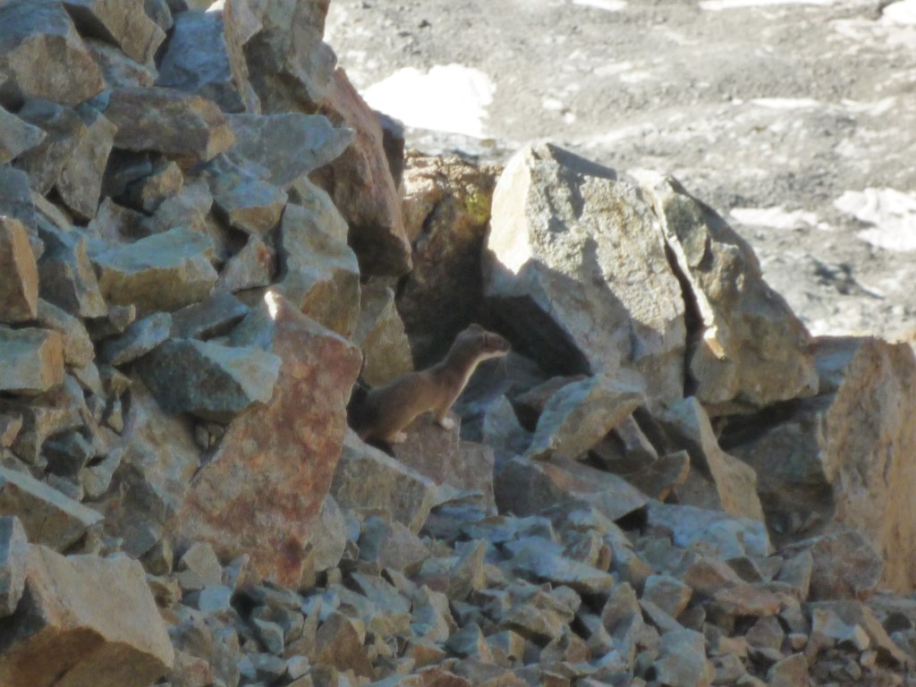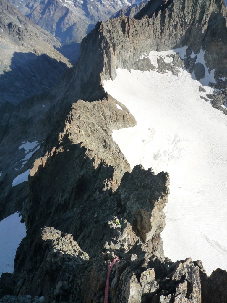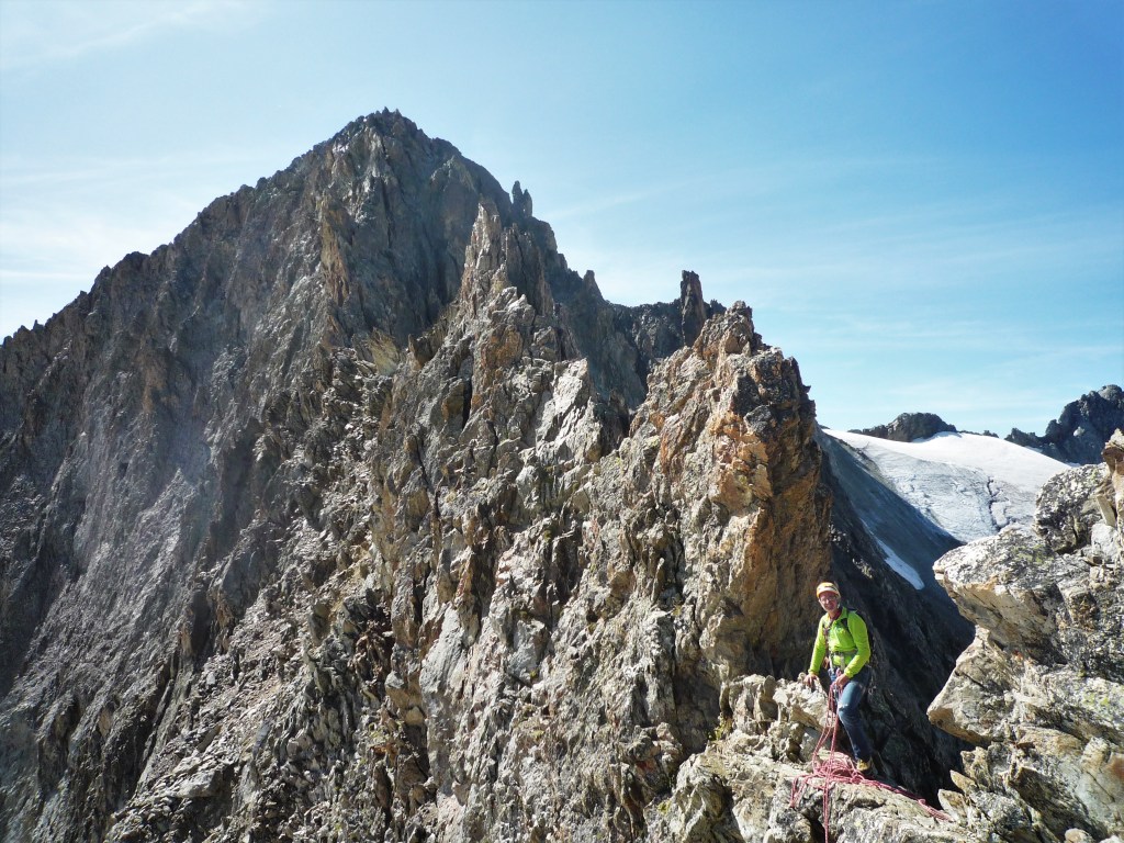 L’arête se redresse sur la fin, cheminées, murs raides puis on arrive au sommet de la Pointe à 3516m. Une hermine bien curieuse vient nous faire un coucou, on se demande ce qu’elle peut bien faire là, mais en fait c’est plutôt à nous de se poser la question !