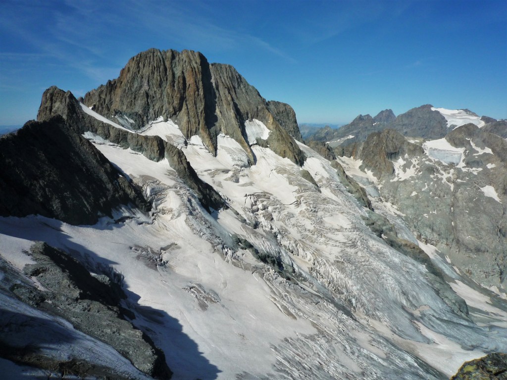 La météo est top et on est tout seuls ! La vue sur les Ailefroides et les Bans est splendide, on voit même le Ventoux !
