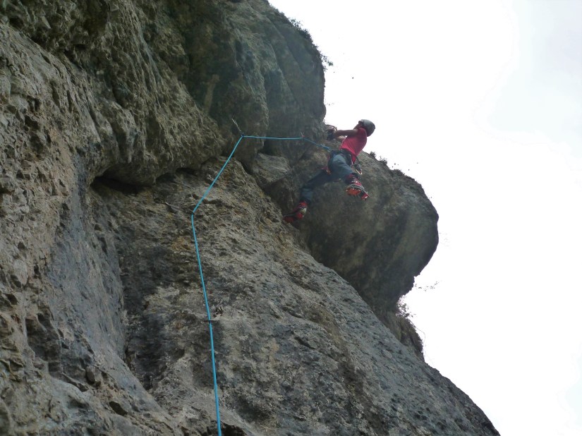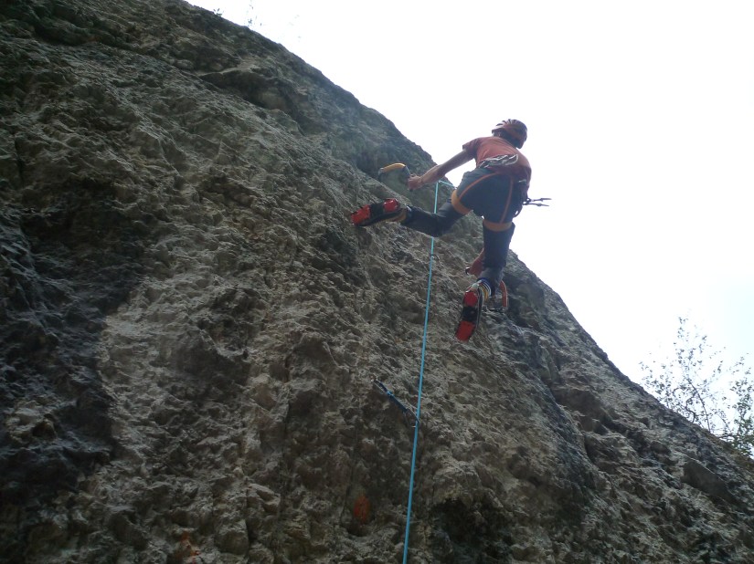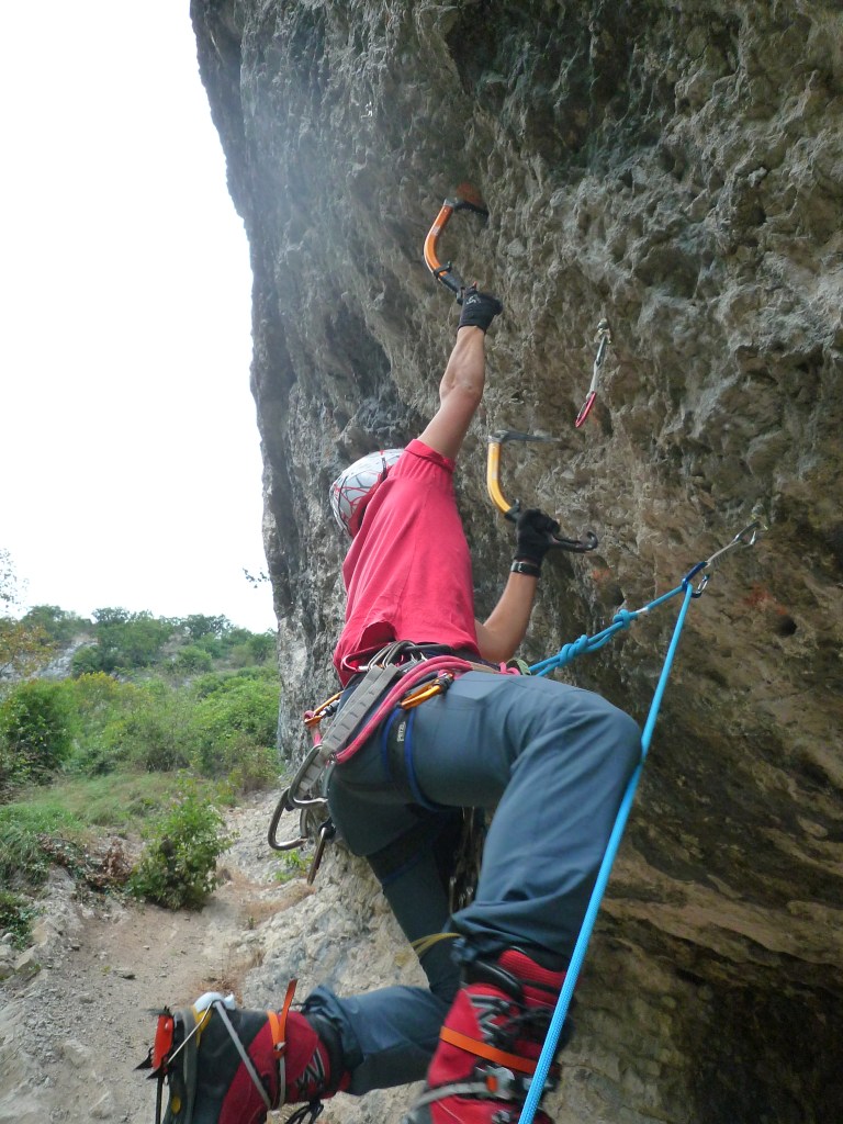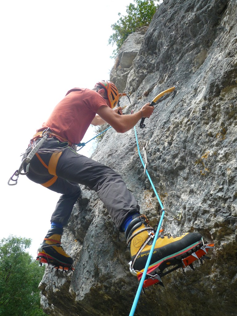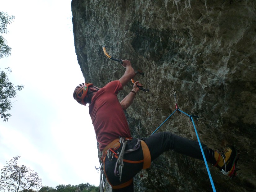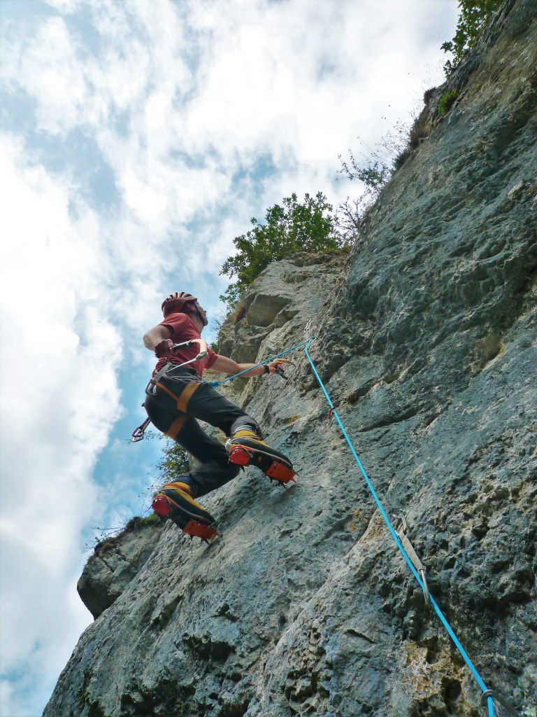 On sort donc les pioches et les monopointes et c’est parti pour fermer le bras ! Ce petit spot tout proche de Chambéry est bien sympa, les voies sont courtes mais raides et c’est bien suffisant pour le bien-être de nos biceps. On commence dans un D5 avant de faire d’autres D5 mais bien plus durs !